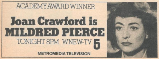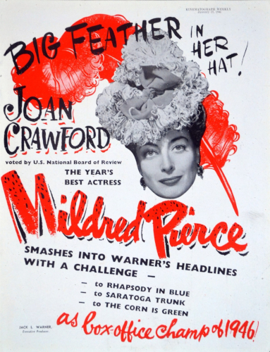 [August 2022], I finally watched Mildred Pierce (1945). For many, MP is Joan’s definitive role, the role for which she won her only Oscar. In terms of career arc, this was Joan’s return to the top of Tinseltown after she left MGM when they kept feeding her bad scripts and giving the good ones to up-and-comers. Mildred Pierce inaugurated a second Belle Époque for JC. I have long assumed that without MP, Joan would have had to either accept supporting/character parts, embrace the burgeoning medium of TV like Barbara Stanwyck did, or---worse yet---endure a Norma Desmond-like descent, forgotten like many erstwhile movie queens who had the audacity to age and/or try to buck the system (think Kay Francis, Helen Twelvetrees, Gloria Swanson [excepting Hollywood Boulevard], etc.). Mildred Pierce gave her fans another decade or so of good-quality Joan product to enjoy. Without MP, I think Joan would have largely faded into obscurity, known mostly by film buffs, her movies infrequently popping up on TCM. Mildred Pierce