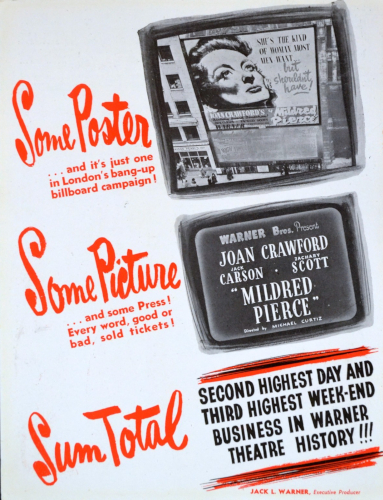 Above: (left) March 7, 1946, Grauman's program. Above (right) Cover of Warners pressbook for Mildred Pierce. Click on image to see pages from the whole book.