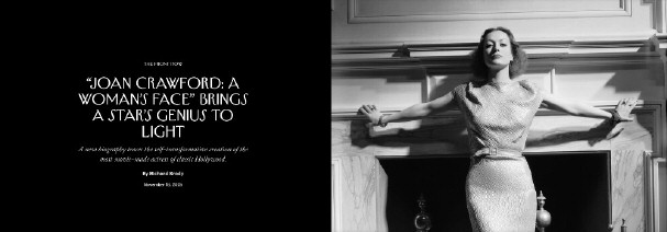 NEWS: The Criterion.com Books section has this blurb RE the new Eyman bio and Richard Brody's current article about it in the New Yorker: Scott Eyman’s Joan Crawford: A Woman’s Face is “a trove of anecdotes, quotes, and insights,” writes the New Yorker’s Richard Brody, “but, above all, it’s the energetic pursuit of an idea: Eyman presents the story of Crawford’s rise to fame as the story of Hollywood stardom itself.” Writing about his “favorite classic-Hollywood actress,” Brody observes that Crawford “took all that was unsayable in Hollywood—all that was unspeakable, all that was ineffable, and all that was unrepresentable in what she’d learned of life, as a child, a clawing outsider, and a star—and brought it all out, one burning fury at a time, in a form of performance that was a music of images. For decades, every time her eyes flashed onscreen, they brought live heat fiercer than the projector bulb that would burn film on contact.”Editor's plea: I stopped subscribing to the New Yorker in 2016, so I don't have access to the above Brody article. Can any kind-hearted reader send me a transcript of it so I can post it on this site? Much obliged in advance! :)