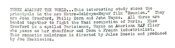 1942. 'Reunion in France' publicity with John Wayne and Philip Dorn.