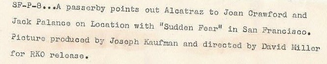 1952. On the set of 'Sudden Fear.' With Jack Palance, looking at Alcatraz.