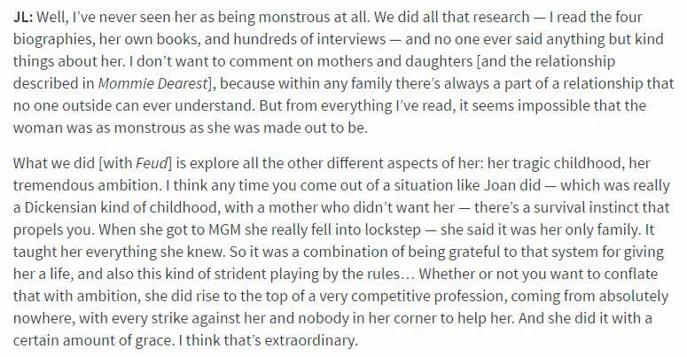 Above: Interview with Jessica Lange (unknown source). Courtesy Lange's Twitter feed, 2/28/17.