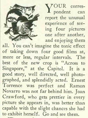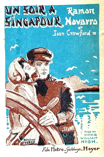 Mordaunt Hall in the New York Times (April 30, 1928): Although "Across to Singapore," the present film offering at the Capitol Theatre, has some expertly composed scenes and genuinely clever acting, the story as a whole is frequently artificial and forced and therefore unconvincing. It is a yarn of a mariner's unrequited love and valiant efforts have been made to give it a sea-worthy quality. The title-writer diligently puts into the mouths of the male element his conception of the lingo of the sea, which smacks more often than not of musical comedy. The shallow attempts at fun are often quite feeble and hardly the sort of thing one hopes for in a serious dramatic subject. It is an in-and-out tale, with good points mixed with poor ones in many of its episodes. Priscilla Crowninshield, the heroine, appears on the long voyage to the Far East looking as if she were ready at any moment for a tea party; but, at the same time, during these episodes there is an excellent conception of sailors fighting a storm at sea. Added to this, one of the brothers Shore, from Paradise Cove, Mass., shouts into the gale: "There's a mad sea and a crazy gale challenging us Shores to fight." When a man is washed overboard and Joel Shore, the youngest of the brothers, is about to leap to the rescue, Mark Shore, played by Ernest Torrence, bellows out: "The sea's hungry, she'd rather have two than one." On the other hand there is a scene in a barroom during which both Mr. Torrence and Ramon on Novarro are decidedly competent. But even here the idea of Joel (Mr. Novarro) flipping stones with unerring aim at Mark and a foreign sailor is rather silly. It is also quite stupid when Joel picks up an unconscious man and proceeds to pretend to fight and lay out his victim. Joel is supposed to be lacking in nerve and strength required for the sea, but this youngster endeavors to prove to his older brothers that he is as good as they are. He is superior to them when it comes to winning the affection of the beautiful Priscilla. It is in Singapore that Mark goes to the bad and his ship has to sail without him. Eventually after the return to Paradise Cove, Priscilla decides to go to Singapore to prevail upon Mark to sober up and return home. The Nathan Ross, as the good ship is named, seems to be ready to go out to the Far East at an hour's notice. William Nigh directed this picture from an adaptation of a story by Ben Ames Williams. He does not always give his characters credit for sufficient intelligence and in the announcing of a betrothal one would think that the man in the case would have mentioned something about it to the girl he hoped to marry. At the end of the church service at which this announcement is made, one perceives Joel standing in the aisle, but apparently he does not attract the attention of a soul. Ernest Torrence is splendid as Mark. Mr. Novarro's performance is also quite good. Joan Crawford, who plays Priscilla, is best in those moments when she is natural and is not thinking about turning her eyes for effect.