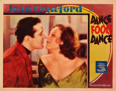 Mordaunt Hall in the New York Times March 21, 1931 Probably "Dance, Fools, Dance" is a good title as motion-picture titles go, but a metaphysician might exhaust his learning trying to reconcile it with the melodrama of newspapers and gangdom in which Joan Crawford is featured at the Capitol. Outside of that and a number of incredible turns in a strictly made-to-order plot, the new picture is a brisk and lively entertainment of its sort, and it brought scattered applause from a thin audience at its first showing yesterday. The scenes of a city room in a metropolitan daily are authentic. The story draws for its drama on two high spots in Chicago's recent crime history—the shooting of Jake Lingle and the celebrated St. Valentine's day massacre. Miss Crawford, as Bonnie Jordan, goes to work as a cub reporter after her wealthy father loses his fortune in the market. Her brother Rodney, a shiftless youth, gets mixed up with a beer-running gang, and is the man at the wheel of the car from which a machine gun mows down seven members of a rival gang. The star reporter, played without the aid of a banjo by Cliff Edwards, is put on the story, learns too much, and is murdered. The paper offers a $25,000 reward for the capture of the murderers. Bonnie is sent out to gain the confidence of the suspected gang chief, Jake Luva, and what happens thereafter is just about what four out of five will suspect at this point in the film. The love motif presents Lester Vail as an heir to millions who regards Bonnie as an empty-headed playgirl, while she has money, and who discovers his love for her only after she has gotten along very well without his aid. Clark Gable's characterization of the gang chieftain is a vivid and authentic bit of acting, and Mr. Edwards makes an interesting reporter. Miss Crawford's acting is still self-conscious, but her admirers will find her performance well up to her standard. William Bakewell never loses sight of the fact that his part calls for a hard-drinking young weakling. On the whole, Harry Beaumont, for his direction, deserves most of the applause for "Dance, Fools, Dance."