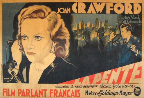 John Campbell in the New York Times (after a showing of DFD at a French film festival) January 10, 1932 ...Another film which has attracted attention in the past fortnight has been "La Pente." This is the dubbed version of "Dance, Fools, Dance" and marks the first of the Metro-Goldwyn-Mayer films completed in Hollywood under their new system. It is also the first appearance of Joan Crawford and Clark Gable here in talking pictures for the French public, although several of their films have been released in small houses in the original versions. For the first time the critics have been lenient with dubbing. Eleven out of fourteen recommended the picture, with the result that the box office records of the Folies-Dramatiques have been shattered. One critic predicted that Gable would become an idol of such importance in France within eight months that he will soon be acclaimed the new Valentino. And it appears to be the presence of the two stars rather than the story of this film—considered by the French to be too brutal—that will make the picture a success throughout French-speaking countries.