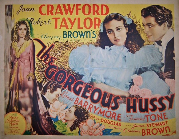 VHS release: 6/24/92. DVD release: 6/15/10. Cast: Joan Crawford (as "Peggy O'Neal"), Robert Taylor, Lionel Barrymore, Franchot Tone, Melvyn Douglas, James Stewart, Alison Skipworth, Louis Calhern, Beulah Bondi, Melville Cooper, Sidney Toler, Gene Lockhart, Clara Blandick, Frank Conroy, Nydia Westman, Charles Trowbridge, Willard Robertson, Ruby DeRemer, Betty Blythe, Zeffie Tilbury. Credits: Based on the 1934 novel The Gorgeous Hussy by Samuel Hopkins Adams. Screenplay: Ainsworth Morgan and Stephen Morehouse Avery. Producer: Joseph L. Mankiewicz. Director: Clarence Brown. Cinematographer: George J. Folsey. Art Director: Cedric Gibbons. Musical Score: Herbert Stothart. Costumes: Adrian. Editor: Blanche Sewell.