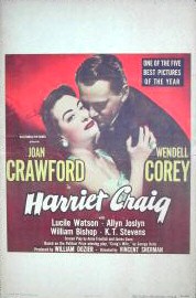 Plot Summary: Harriet Craig is the third film version of George Kelly's Pulitzer Prize-winning play Craig's Wife. Joan Crawford stars as the title character, a thoroughly selfish woman who prizes her house and her possessions above all else. Harriet Craig is even willing to spoil the business opportunities of her husband Walter (Wendell Corey) to avoid losing her precious home. When her self-involvement causes turbulence in the romantic life of her cousin (K.T. Stevens), and when her husband's eyes are finally opened to his wife's true nature, Harriet Craig is at long last hoist on her own petard. ~ Hal Erickson, All Movie Guide