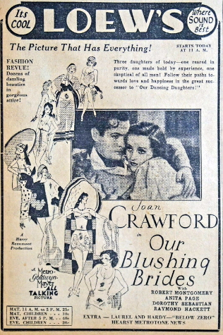 After surviving many pictorial fashion shows and handsome close-ups of the decorative Joan Crawford, the spectator is given to understand that the life of a salesgirl, as depicted in "Our Blushing Brides," is not just measuring yard goods and taking trips to Coney Island. Such a simple existence, according to the film at the Capitol, is not for either Geraldine, Connie or Francine, the three heroines whose lives twist down tortuous paths—one ending in death, another almost approaching that "fate worse than death," and the third triumphant in her virtue. All three girls yearn for the trappings that make for a comfortable life, and the two who sacrifice their hall rooms for modernistic settings pay the piper. Connie goes to her death by poison after her David, a social lion, has led her to believe that marriage is the pot of gold at the end of their pre-marital adventures. Francine becomes attached to one whom she believes to be a millionaire, but who is caught as a thief. Gerry, however, true to her principles, remains the paragon and profits in the end by marrying Tony Jardine, the son of the department store owner. Considering that the program admits that the dialogue was written in part by John Howard Lawson, the lines are surprisingly dull. Miss Crawford admirably survives all her agonized facial contortions. She carries the burden of dramatics in this photoplay and comes off splendidly and intelligently. Dorothy Sebastian as Francine is excellent and so is Anita Page as the blond Connie, Robert Montgomery, in the rôle of Tony, the young scion who builds studios in trees as a place where "he can get away from it all," is acceptable. If by getting away from it all he means the angular settings that Cedric Gibbons has conceived, he is justified. Even the little studio in the tree, for example, when seen from inside, might have occupied a good portion of any armory.