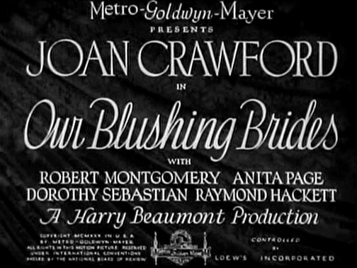 US release: 7/19/30. On-demand DVD release from Warner Archives: 3/4/14. Cast: Joan Crawford (as "Jerry March"), Robert Montgomery, Anita Page, Dorothy Sebastian, Raymond Hackett, John Miljan, Albert Conti, Edward Brophy, Hedda Hopper. Credits: Based on a story by Bess Meredyth. Screenplay: Bess Meredyth and John Howard Lawson. Additional dialogue: Edwin Justus Mayer. Director: Harry Beaumont. Camera: Merritt B. Gerstad. Editors: George Hively, Harold Palmer. Costumes: Adrian. Art director: Cedric Gibbons.