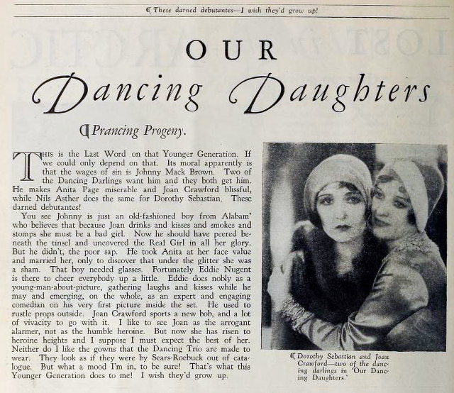 Mordaunt Hall in the New York Times (October 8, 1928) Hundreds of girls and young women were attracted yesterday to the Capitol Theatre and their presence probably was due chiefly to the title of the film feature, "Our Dancing Daughters," a chronicle concerned with the wild young people of this generation. The Capitol now is equipped for the reproduction of sounds, which fact was only too patent yesterday, for while "Our Dancing Daughters" is not furnished with dialogue, it has a musical accompaniment, several love songs, stentorian cheering and, at the end, a chorus of shrieks. Whether this audible mixture adds to the entertainment value of the picture is a matter of opinion. It assuredly detracts from the action of the picture in some of the sequences. The romantic melodies that accompany the love-sick looks and the violent embraces of the principal characters are reminiscent of the oldtime singing to lantern slides. The enthusiastic cheering impresses one as though the producers wanted to make the most of sound, and the shrieks in the closing scenes come from mute figures to whom terror has suddenly given tongues. There is nothing startingly novel about "Our Dancing Daughters," for while there is an undeniable vivacity to many of the scenes, the action is not particularly well portrayed and it is frequently anything but conservative. Cocktails, flasks and mad dancing appear in quite a number of episodes. It is quite unnecessary to depict an intoxicated girl, as is done for considerable length in this film. Presumably it is to point a moral, for the young woman falls to her death down a flight of stairs. The wide-eyed Joan Crawford, who is attractive in many of the scenes, figures as one of the dancing daughters. After an unusually violent terpsichorean performance, this young woman, known as Diana, suddenly takes an interest in Ben Blain, a stranger to the hectic life but the son and heir of a multi-millionaire. Harry Beaumont, the director, has among his worthy sequences in this film, one in which the fractious Diana tells her companion, Beatrice, that she is in love. This incident is quite appealing and it caused great glee yesterday afternoon. But Diana is doomed to be disappointed, for a little blonde, the daughter of a mercenary mother, succeeds in capturing the heart of the peculiarly susceptible Mr. Blain. This fair-haired minx, named Anne, soon leads Mr. Blain to the altar and poor Diana is left to brood over a blighted life. Josephine Lovett, who wrote "Our Dancing Daughters," cannot be accused of much subtlety in ridding Mr. Blain of his tempestuous bride. John Mack Brown is sympathetic as Mr. Blain. Dorothy Sebastian is appealing as Beatrice. Anita Page gives a fairly good portrayal of her idea of a dancing daughter. Bland Johaneson in the New York Mirror (1928): Joan Crawford, as the girl who was free and wild but maintained her ideals, does the greatest work of her career. She has a typical Clara Bow role and she gives a lively run around for first honors as a modern flap. Joan has beauty, charm and more refinement than the trim-legged Bow. She makes you believe she's straight even through the torrid, questionable scenes she is required to play. She also shows a snappy Bow figure and she can dance a mean varsity drag.