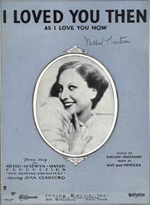 Above: A 78 rpm Columbia record label for "I Loved You Then As I Love You Now," and sheet music for the song. At right: A US theater glass slide.