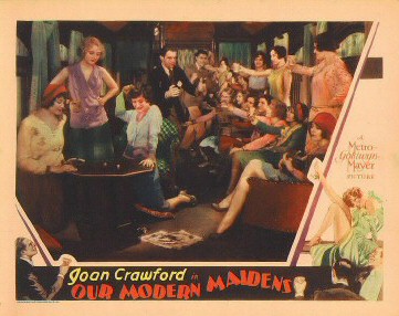 Our Modern Maidens, Joan's last silent film, isn't exactly a sequel to the previous year's smash hit Our Dancing Daughters despite its parallel title, but it does continue the adventures of the young, fast, rich set, anchored here by Joan's "Billie," another modern wild-but-decent daughter. Like OurDD, OurMM features wild parties, drinking, and dancing by jazz-baby Joan, as well as some snappily risque (for the time) dialogue along the lines of "There's something in my pocket...Dig for it" (um, that's an engagement ring that Billie comes up with) and "Lunch is poured!"