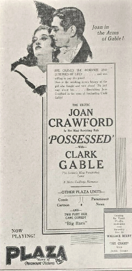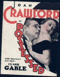 Notes: • This was Joan's 3rd of 8 films with Clark Gable. The two began an affair while filming, which would continue off and on until his death in 1960. • The film was shot in 26 days, beginning 9/21/31. • It cost $378,000 and made a profit of $611,000. (Mayer and Thalberg, by Samuel Marx) • Possessed ran into trouble with British censors because of the unwed status of the main characters. To placate the censors, MGM production chief Irving Thalberg had some scenes reworked for the UK audience: In this alternate version, Gable is married to an invalid (unlike the US version, where his wife has run off with his chauffeur) and he remains physically loyal to her while platonically in love with Joan until the wife later dies. (Ultimate Star) • The film was released in France with the title Fascination. (JCB)