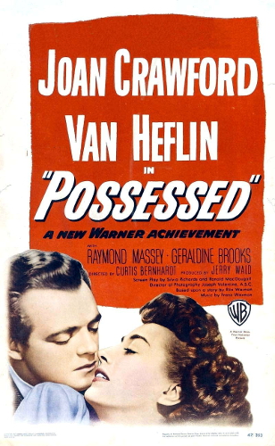 Variety (1947) Joan Crawford cops all thesping honors in this production with a virtuoso performance as a frustrated woman ridden into madness by a guilt-obsessed mind. Actress has a self-assurance that permits her to completely dominate the screen even vis-a-vis such accomplished players as Van Heflin and Raymond Massey. Heflin’s part of a footloose engineer who romances his ladies with one eye on the railroad schedule is now drawn with equal sharpness. By sheer power of personal wit, however, Heflin infuses his role with charm and degree of credibility despite a lack of clear motivation for his behavior. Unfolding via flashback technique, film opens with a terrific bang as the camera picks up Crawford wandering haggard and dazed through Los Angeles until she collapses. In the psychiatric ward of the local hospital, under narco-hypnosis, she relives the series of personal blows that ultimately reduced her to schizophrenia. Despite its overall superiority, Possessed is somewhat marred by an ambiguous approach in Curtis Bernhardt’s direction. Film vacillates between being a cold clinical analysis of a mental crackup and a highly surcharged melodramatic vehicle for Crawford’s histrionics.