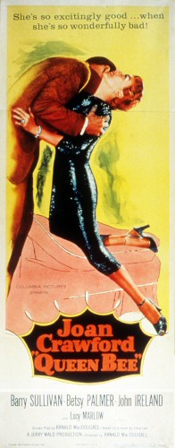 Bosley Crowther in the New York Times The Screen: 'Queen Bee'; New Film at Loew's State Drones AlongLet's say the role that Joan Crawford plays in Columbia's "Queen Bee," yesterday's arrival at Loew's State, is that of a honey you love to hate. As the wife of a Southern mill owner whom she has driven to bitterness and drink by her ruthless, self-seeking machinations and frank infidelity, she is the height of mellifluous meanness and sleek insincerity. When she is killed at the end, as she should be, it is a genuine pleasure and relief. The one blatant trouble with this picture, for which Ronald MacDougall is to blame, since he was the writer and director, is that the killing is too long postponed. Five minutes after Miss Crawford appears on the luxurious scene, acting the queen bee like a buzz saw and oozing her unctuous poison from every cell, it is evident —no, it is mandatory—that she should be taken out and shot or run off a cliff in an automobile, which is how it is finally done. This act of mercy is performed by John Ireland, who clearly has nothing to lose, since Miss Crawford has already driven his fiancée, Betsy Palmer, to destroy herself. As a matter of fact, Mr. MacDougall takes so long in getting this picture to the point that even a patient observer might entertain some lethal thoughts toward him. For an interminable time, he lets Miss Crawford flaunt her noxiousness and bad acting all over the place, while Barry Sullivan blinks and boozes as her husband and Lucy Marlow gawks and quakes as her disillusioned niece. When the deed is finally done by Mr. Ireland, nothing has really been achieved except a mawkish manifestation of cheap dramatics. We've enough of those all over the world these days. QUEEN BEE, screen play by Ranald MacDougall, based on a novel by Edna Lee; directed by Mr. MacDougall; a Jerry Wald Production presented by Columbia. At Loew's State.
