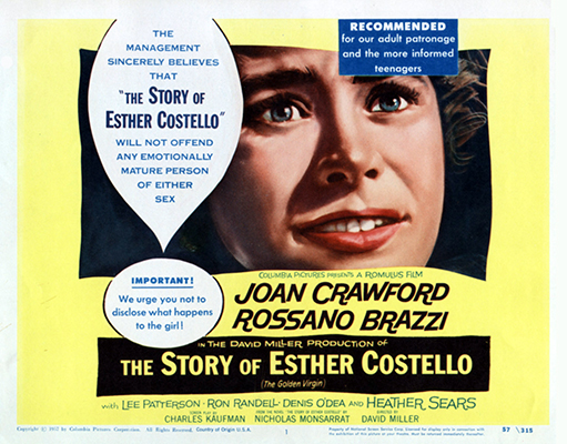 Plot Summary: The Story of Esther Costello is the cinematic equivalent of eating a whole box of potato chips; you may hate yourself, but you'll relish every bite in the meantime. Joan Crawford plays a well-meaning woman who throws herself whole-hog into every charitable cause that comes down the pike. She is married to Rossano Brazzi, who is as greedy as Crawford is generous. Crawford rescues blind deaf-mute Heather Sears from her squalid surroundings, leading to her creation of a charity campaign on behalf of handicapped children, with Sears as "poster child." Brazzi, in league with crooked promoter Ron Randell, seizes upon this as a means to line his own pocket--and one night, he decides to assert his manhood with the helpless Sears. The shock of this assault causes the girl to instantly regain her sight and hearing! Crawford reacts to her husband's outrage by driving her car into a tree, snuffing out Brazzi's life as well as her own. Sears--or Esther Costello, for she is indeed the title character--finds happiness with an honest young reporter (Lee Patterson). Set in America and released by an American company (Columbia), The Story of Esther Costello was nonetheless filmed in its entirety in England. ~ Hal Erickson, All Movie Guide