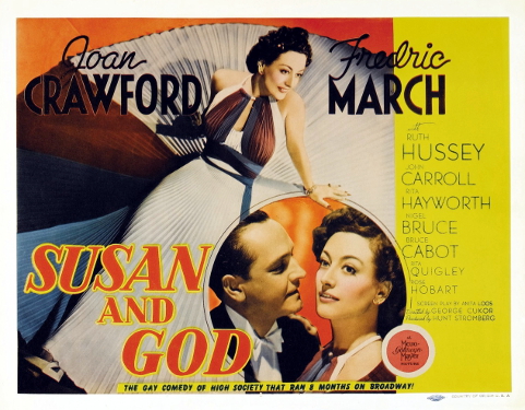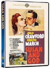Plot Summary: Rachel Crothers' thoughtful stage play Susan and God was tastefully adapted for the screen by Anita Loos. Joan Crawford stars as Susan, whose unquestioning devotion to various religious organizations causes a great deal of strain between herself and her family. When Susan embraces a "New Thought" theological movement, she decides to apply the tenets of this new philosophy to patch up the unhappy marriages within her own social circles. She succeeds only in making things worse, and in further harming her own relationship with husband Barrie (Fredric March) and daughter Blossom (Rita Quigley). But it is the unadorned, unpretentious religious faith of little Blossom that ultimately brings Susan and Barrie together again. When Susan and God was first released in 1940, Joan Crawford's performance was occasionally compared unfavorably to that of Gertrude Lawrence, who created the role of Susan on Broadway; it was suggested by some that Crawford patterned her portrayal exactly on Lawrence's, right down to the line delivery. Modern audiences, denied the opportunity to see Lawrence's interpretation, are less inclined to downgrade Crawford's work, which rates among her best. ~ Hal Erickson, All Movie Guide