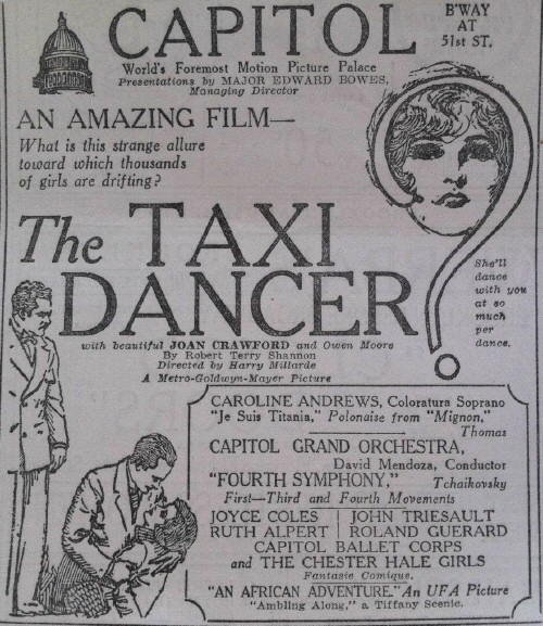 Notes: * "The Taxi Dancer" was first published as a syndicated newspaper serial beginning in May 1926. By June, MGM had synopsized it, and by September the studio had completed a full scenario. (biblio.com) * Musical accompaniment when the film opened at NYC's Capitol theater: Overture, Tchaikovsky's "Fourth Symphony;" "Ambling Along," a scenic; "Fantasie Comique," with Joyce Coles, John Triesault, Ruth Alpert and Roland Guerard; "An African Adventure," a Ufa film.