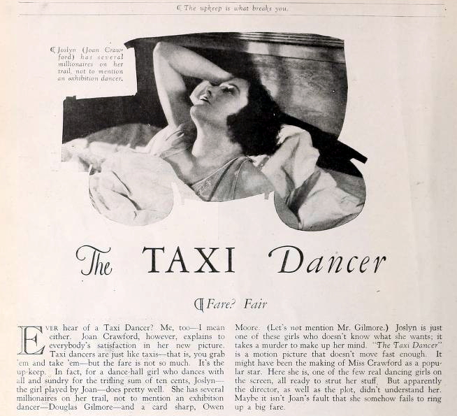 Plot Summary: Impoverished Southern belle Joslyn Poe (Joan Crawford) heads to New York, hoping to become a professional dancer. Unable to land work on Broadway, she becomes a taxi dancer in a cheap dive, where her cardsharp boyfriend Lee Rogers (Owen Moore) whiles away his time fleecing the suckers. Hoping to escape her tawdry surroundings, Joslyn latches on to supposed gentleman James Kelvin (Douglas Gilmore). But when Kelvin turns out to be a thief and a murderer, Joslyn returns to the arms of Rogers, who isn't such a bad guy after all. Publicity stills from The Taxi Dancer show Joan Crawford dancing atop a taxicab -- but alas, no such scene appears in the film. ~ Hal Erickson, All Movie Guide