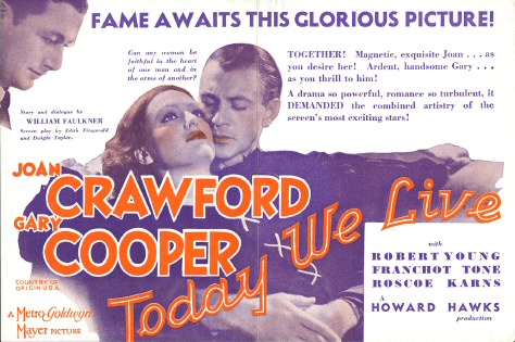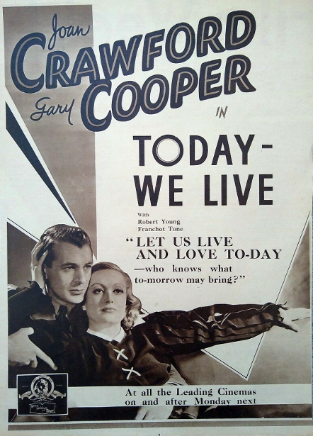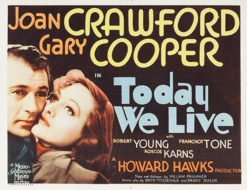 Joan Crawford and Gary Cooper in the First Picture Derived From a Story by William Faulkner.Bearing the title of "Today We Live," there is now at the Capitol the first of William Faulkner's literary efforts to reach the screen. It is said to have been derived chiefly from a short story called "Turn About," which is understood to have been amplified in the studio by the author. Although it is more than slightly different from the general run of cinematic works, it is at times vague and cumbersome. It possesses, however, the spark of sincerity, and its lack of clarity might be ascribed either to Howard Hawks's direction or to the script contributed by Edith Fitzgerald and Dwight Taylor, for there are sequences that are far too lengthy and others that would be considerably improved by more detail. As a drama of the war it is not precisely convincing, for coincidences play an important part in its arrangement. It is also anachronistic, particularly as regard the costumes worn by Joan Crawford. The narrative begins in London, but most of the action occurs in and around Boulogne. Diana Boyce-Smith, an English girl, played by Miss Crawford, is in love with Claude Hope, but after she encounters an American named Richard Bogard her affections sway to him. Subsequently she hears that Bogard has met death as an aviator and she continues her affair with Hope without benefit of clergy. Her brother, Ronnie, is always in her confidence, but he sympathizes with Hope, for he and Hope are both officers in the British Navy and on the same craft. Judging by what happens during one prolonged episode, Bogard, who is another of those fliers who is thought dead but eventually is found alive, scoffs at sea warfare as it is carried on by Ronnie and Hope, and he gives the latter a taste of fighting in the clouds. They return safely and Ronnie in turn dares Bogard to come out in his motor launch, which is equipped with a single torpedo. Bogard thus learns that there is as much excitement on the water as in the air, and, in the course of the daring attack on enemy vessels, Hope is blinded by a missile. The rivalry between the aviator and the naval officer persists to the end—when, after hearing that Bogard has volunteered to sacrifice his life to sink an enemy ship, Ronnie and the sightless Claude Hope speed out in their craft and succeed in accomplishing the desired task at the cost of their lives, before Bogard has a chance to swoop down from the air. So there are three heroes in this story. The romance between Bogard and Diana is set forth so abruptly that it is apt to seem absurd. The constant meeting of the four characters in France scarcely adds to the credibility of the story, and the activities supposed to be in the North Sea give the impression that German vessels were either hovering around or anchored somewhere in the vicinity of Boulogne. The producers could not possibly mean that the attacks were on Zeebrugge, for there is nothing that bears a semblance of the famous mole. Miss Crawford, although she never impresses one as being English, gives a steadfast and earnest portrayal. Robert Young is excellent as Hope, and Franchot Tone does well as Ronnie. Gary Cooper is quite believable as Bogard.