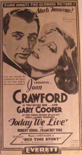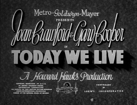 Today We Live ranks down among my least favorite of all Joan films. (Trog, Goodbye My Fancy, This Modern Age, and Esther Costello share the dubious distinction.) Despite direction by Howard Hawks, story and dialogue by William Faulkner, and Gary Cooper for a co-star, the film's a boring and implausible mess (and was Joan's only box-office flop for MGM up until The Ice Follies of 1939).
