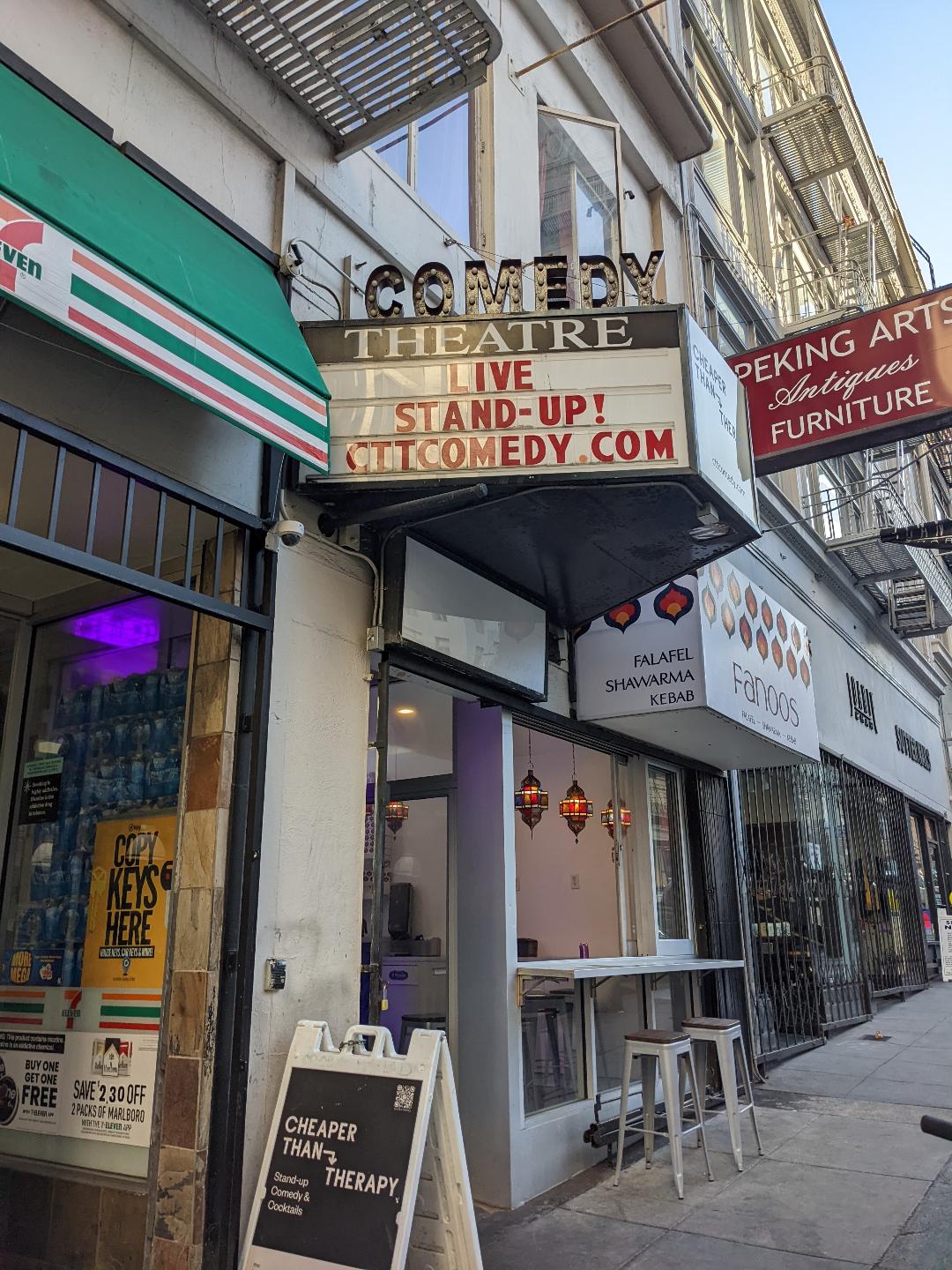 Above: 533 Sutter St. entrance to the play. Larger comedy club and bar downstairs; the 99-seat Theater 33, where the play was presented, is upstairs.