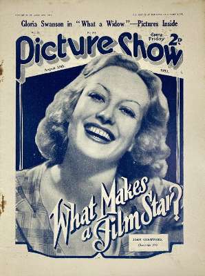 ----------------------------------------------- Other known issues of Picture Show featuring Joan: April 1929: Rose-Marie insert/pullout photo spread. December 7, 1929. Our Dancing Daughters insert/pullout spread. March 15, 1930. November 7, 1942. January 20, 1951. March 6, 1954. Torch Song. 16 pgs. |