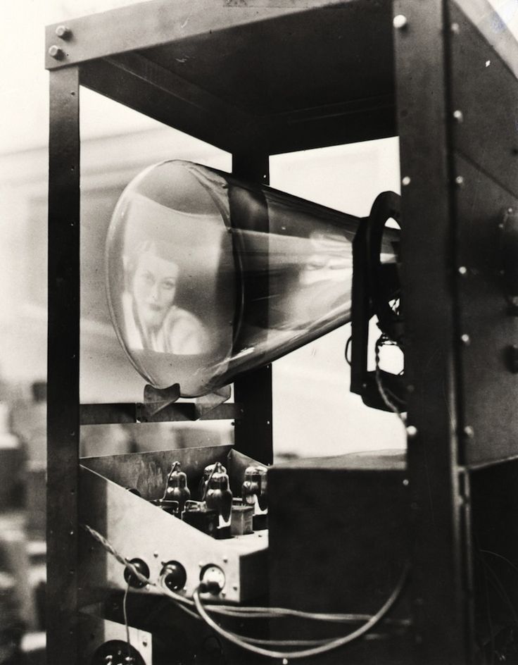 1928, and to the public at the Franklin Institute in Philadelphia on August 25, 1934. Pictured above is [the August 1934] televised picture of Joan Crawford as it appeared on the cathode tube in the receiving room at the Franklin Institute. |