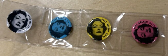 Below: Pins promoting the 1981 Blue Oyster Cult song "Joan Crawford."