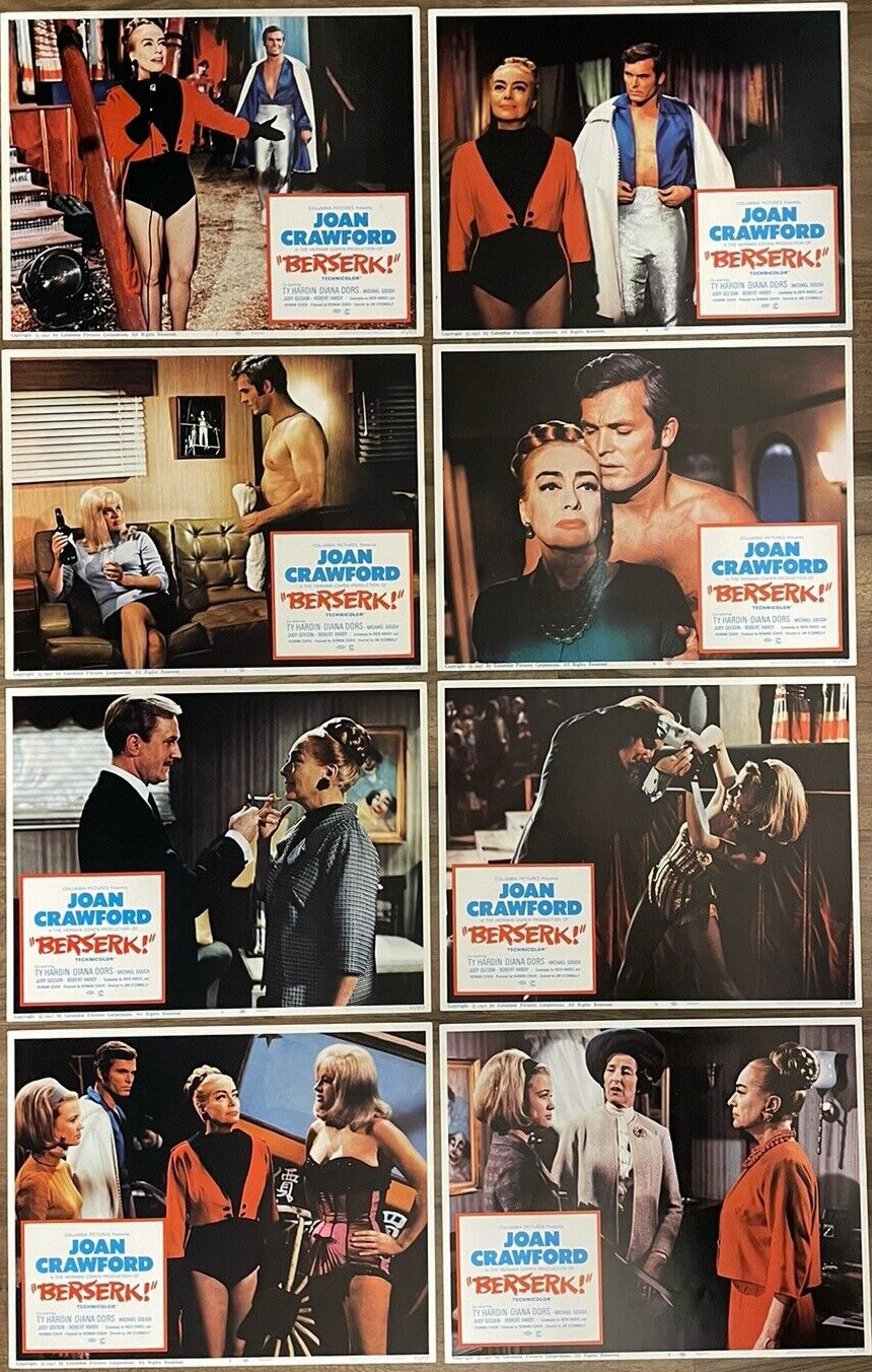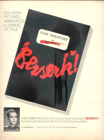 Miss Crawford was acting in her past. She told herself and said to reporters like Shirley Eder that it was not a horror film, and she had the original title changed from Circus of Blood to Berserk (oh gee, that changes my mind!). It was originally filmed three times before -- in 1937 as The Shadow (Columbia pictures) starring Rita Hayworth!! Then in 1960 as Circus of Horrors and in 1967 as Circus of Fear, both in the UK. (By the way, Miss Crawford’s version broke all records in Dayton and Columbus, Ohio!)