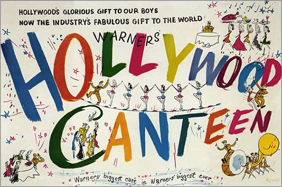 Hollywood Canteen, a WW II "Support the troops!" propaganda picture, was the first film Joan made for her new studio, although she only appears for less than 2 minutes, along with dozens of other top Warners stars. The film is based on the goings-on at the real-life Hollywood Canteen, founded by Bette Davis and John Garfield and located at 1451 Cahuenga Blvd in Hollywood from 1942 through 1945.
