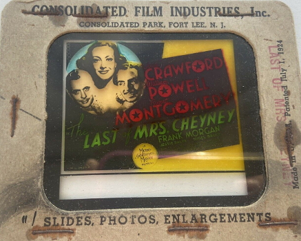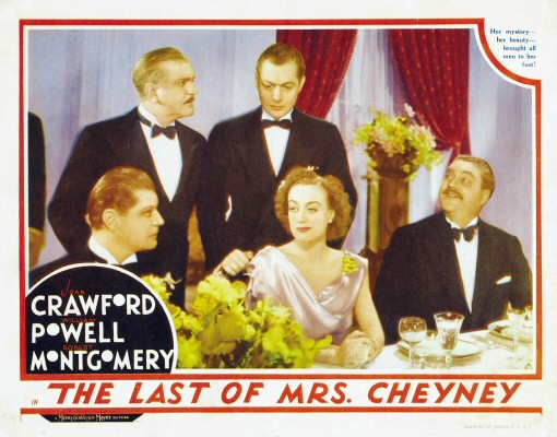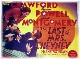 VHS release: 6/24/92. DVD on-demand release from Warner Archives: 3/4/14. Cast: Joan Crawford (as "Fay Cheyney"), William Powell, Robert Montgomery, Frank Morgan, Jessie Ralph, Nigel Bruce, Colleen Clare, Benita Hume, Ralph Forbes, Aileen Pringle, Melville Cooper, Leonard Carey, Sara Haden, Lumsden Hare, Wallis Clark, Barnett Parker. Credits: Adapted from the 3-act play "The Last of Mrs. Cheyney" by Frederick Lonsdale. Screenplay: Leon Gordon, Samson Raphaelson, and Monckton Hoffe. Producer: Lawrence Weingarten. Director: Richard Boleslawski. (Boleslawski died in the middle of filming and the film was finished by Dorothy Arzner, who was uncredited.) Camera: George Folsey. Art Director: Cedric Gibbons. Music: Dr. William Axt. Editor: Frank Sullivan.