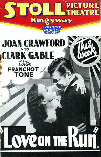 A slightly daffy cinematic item of absolutely no importance, "Love on the Run," is currently at the Capitol, with Clark Gable, Joan Crawford and Franchot Tone in roles that by now are a bit stale. In all good conscience, the film ought to bow, in turn, to several distinguished antecedents, for it has borrowed liberally here and there of tried and true screen devices and situations.