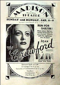 Abel Green in Variety (1932): It turns out to be a mistake to have assigned the Sadie Thompson role to Miss Crawford. It shows her off unfavorably. The dramatic significance of it all is beyond her range.... [Director] Milestone tried to achieve action with the camera, but wears the witnesses down with words. Joan Crawford's get-up as the light lady is extremely bizarre. Pavement pounders don't quite trick themselves up as fantastically as all that. In commercial favor of Rain is the general repute of the theme and Miss Crawford's personal following, but the finished product will not help either. |