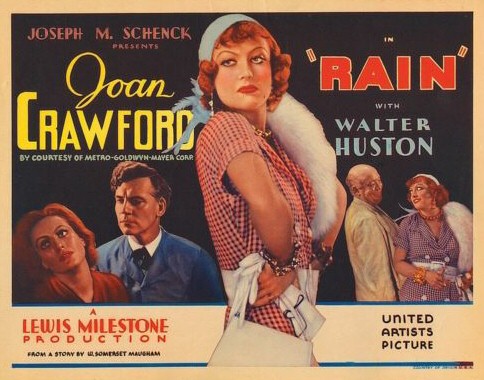 VHS release: 1/25/00 (VCI); 2/27/01 (Image); 3/23/04 (Allied) DVD release: 8/10/99 (Roan); 2/27/01 (Image) Blu-ray release: 9/27/22 (VCI) Cast: Joan Crawford (as "Sadie Thompson"), Walter Huston, William Gargan, Beulah Bondi, Matt Moore, Kendall Lee, Guy Kibbee, Walter Catlett, Ben Hendricks Jr., Fred Howard. Credits: From the play "Rain," adapted by John Colton and Clemence Randolph from the story by W. Somerset Maugham. Screenplay: Maxwell Anderson. Director: Lewis Milestone. Producer: Joseph Schenck. Camera: Oliver T. Marsh. Art Director: Richard Ray. Music: Alfred Newman. Editor: W. Duncan Mansfield. Plot Summary: The pleasures of the flesh confront the discipline of the Lord's teachings in this screen adaptation of W. Somerset Maugham's story Miss Sadie Thompson. Sadie Thompson (Joan Crawford) is a sassy streetwalker who lands in Pago Pago in the South Pacific after an epidemic grounds the ship on which she's booked passage. Sadie's shapely legs, free spirit, and quick wit soon attract the attention of a group of American soldiers stationed on the island; while most are motivated by simple lust, the naive Sgt. O'Hara (William Gargan) falls head over heels for Sadie, thoroughly unaware of her checkered past and shameful profession. Rev. Alfred Davidson (Walter Huston), a fire-and-brimstone preacher bent on bringing salvation to the soldiers, is fully aware of Sadie's occupation and moral code, and is determined to convince her to change her ways. Sadie slowly but surely is softened by Davidson's conviction, but the preacher soon finds himself affected by her sensual presence; O'Hara also learns the truth about Sadie, but hatches his own plan to reform her -- marriage. While a box office failure in 1932, Rain has gone on to become a cult favorite, thanks to Crawford's vivid performance as Sadie and director Lewis Milestone's adventurous visual style. ~ Mark Deming, All Movie Guide