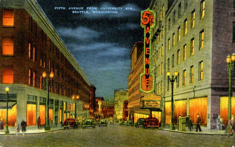 Above: A 1940 Seattle, Washington, postcard with "Strange Cargo" featured on marquee at right.