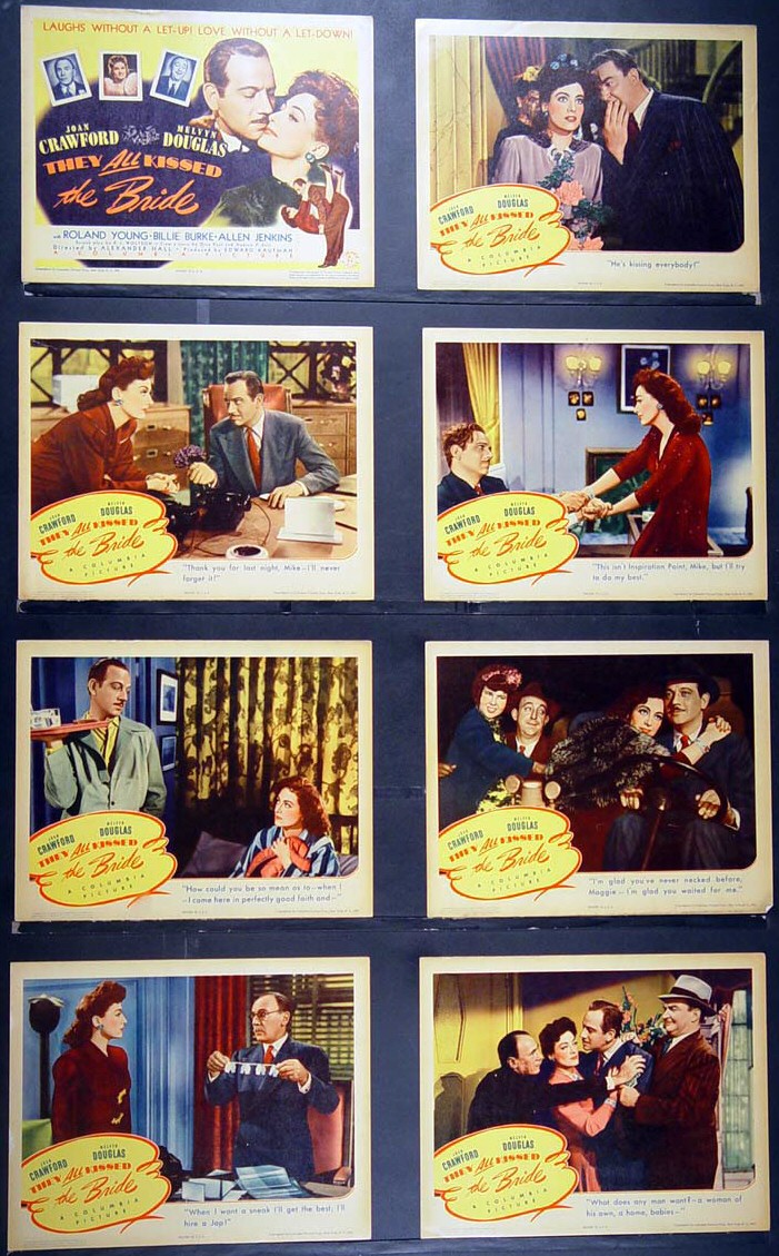Plot Summary: Joan Crawford is the kissable bride of the title--but when the film opens, matrimony is the farthest thing from her mind. Crawford becomes a big-time executive upon inheriting her father's trucking business, which leaves her no time for such trivialities as romance. To enhance her business, Crawford arranges a marriage of convenience for her younger sister (Helen Parrish). At the wedding, Crawford meets reporter Melvyn Douglas, who is out to discredit Crawford....and you know what's coming next. They All Kissed the Bride was one of several 1942 productions originally slated for Carole Lombard, whose sudden death in a plane crash required all the major studios to reshuffle their production schedules to come up with last-minute Lombard replacements. ~ Hal Erickson, All Movie Guide