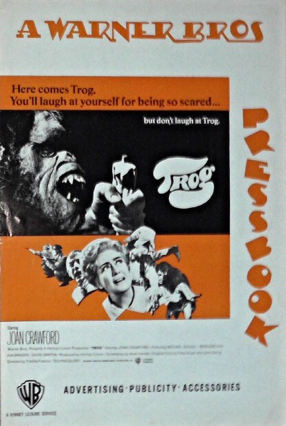 Anonymous in the New York Times October 29, 1970 Three hours of British-made pseudo science fiction and horror, such as "Trog" and "Taste the Blood of Dracula" that drenched the screens of the DeMille and other houses yesterday in ersatz plots and gore, could conceivably encourage potential movie buffs to turn, say, to the charms of plumbing. This might not be a disservice since neither entry shocks entertainingly nor enlivens the ailing cause of the B-type thriller on the lower half of double bills. There is, however, a rudimentary virtue in "Trog," a sort of second cousin, 15 years removed from "Creature From the Black Lagoon," in that it proves that Joan Crawford is grimly working at her craft. Unfortunately, the determined lady, who is fetching in a variety of chic pants suits and dresses, has little else going for her. As the anthropologist chief of a research center that has unearthed a living, hairy, half-caveman half-ape, Ice Age "missing link," a troglodyte she cutely nicknames 'Trog' and attempts to rear as you would a backward child, she poses no threat either to Dr. Margaret Mead or Dr. Spock. Of course, there"s the villainous Michael Gough who goads the gentled 'Trog' 'into murdering several villagers, a rampage that leads to "Trog's' climactic destruction. "I never expected this," one of Trog's discoverers exclaims. But thanks to a script that makes everything vapidly obvious from the start, 'Trog' is no more exciting or scientific than the antics of a rambunctious kid in a progressive school.... [review continues with opinion of "Taste the Blood of Dracula"]