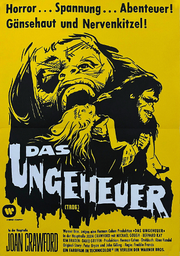 VHS release: 8/22/95 DVD release: 6/26/07 Blu-ray release: 12/07/21 (Shout Factory) Cast: Joan Crawford (as "Dr. Brockton"), Michael Gough, Bernard Kay, Kim Braden, David Griffin, John Hamill, Thorley Walters, Jack May, Geoffrey Case, Robert Hutton, Simon Lack, David Warbeck, Chloe Franks, Maurice Good, Joe Cornelius (as "Trog"). Credits: Story: Peter Bryan, John Gilling. Screenplay: Aben Kandel. Director: Freddie Francis. Producer: Herman Cohen. Original Music: John Scott. Camera: Desmond Dickinson. Editor: Oswald Hafenrichter. Art Director: Geoffrey Tozer.