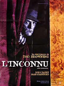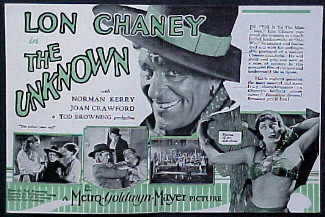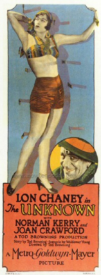 Plot Summary: As a group, the silent-movie collaborations between director Tod Browning and star Lon Chaney hardly represent the best work of either man, though each film definitely has its moments. One of the best, and weirdest, of the batch is The Unknown. Chaney plays a carnival performer known as the "Armless Wonder," who performs near-miraculous stunts with his bare feet. In fact, he is in possession of both his arms, but keeps them strapped to his side to maintain the illusion of being limbless. Chaney's beautiful assistant Joan Crawford has a pathological fear of being touched by any man. This leads Chaney to believe that he is attractive to Crawford so long as his keeps his arms hidden. Halfway through the film, Chaney murders the circus manager--a crime witnessed by Crawford, who was only able to glimpse Chaney's distinctively mutated thumb. To cover up his crime, and to make himself the perfect mate for Crawford, Chaney blackmails a doctor into amputating his arms. Upon returning to the carnival, the now-genuinely armless Chaney learns to his horror that Crawford has overcome her aberration of being touched, thanks to handsome circus strong man Norman Kerry. Enraged, Chaney plots to kill Kerry in a horrible fashion...but guess who ends up seriously dead? ~ Hal Erickson, All Movie Guide