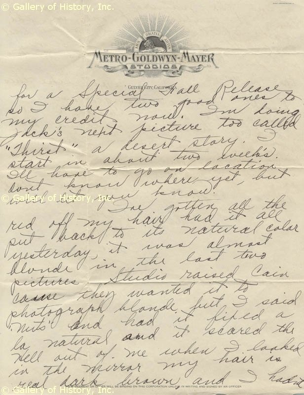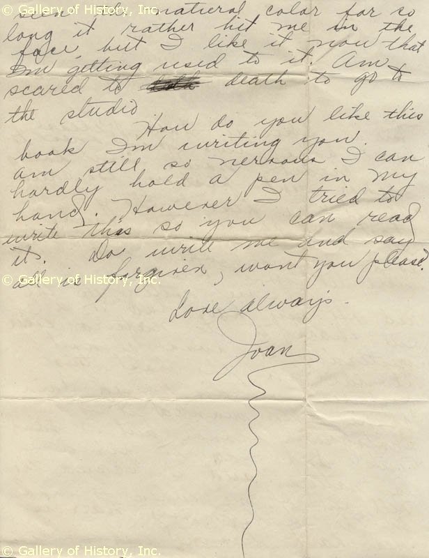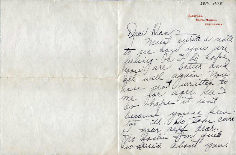 You see I did have cause for worry when you were ill and you begged me not to. And I count you as my bestest, truest most devout friend Dan, and I've been so neglectful lately (or so it seems). No wonder you give up hopes of ever hearing from me. Ah I'm am truly ashamed Dan, but you above all people know when you work hard all day long..[missing text] my family just arrived out here two one week and Mother two weeks later, that's been quite a burden also. Getting a place for them to live. Getting my brother and his wife jobs, and thousands of exhibitors out here having lunch, reporters from the four corners of the earth interviewing you, Mother's Birthday this week, Thanksgiving next, starting Christmas shopping, more law suits, Signing new contracts, still getting my house furnished. And worst of all the talking pictures. On my Sundays off I sew all day at Pickfair until Dodo,Uncle Doug - and Mary go mad when they see a meedle needle & a spool of thread...Poor Blessed Dodo hasn't had much attention lately but as long as he knows I love him, I hope he understands.... [missing text] about your health. Do keep me more closely informed as to your health, dear, wont you? May I hear from you soon -- Please??? As ever Joan.